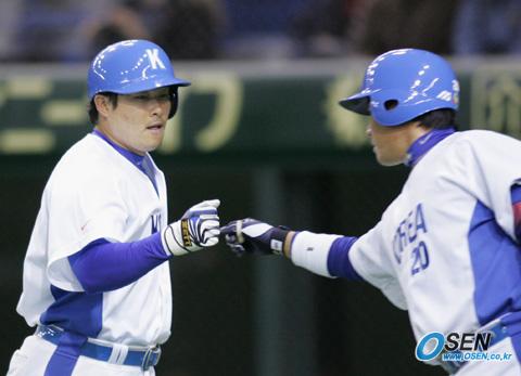 1일 도쿄돔에서 열린 한국 대표팀과 일본 롯데 지바 마린스의 WBC 공식 연습경기는 한국이 이승엽과 김동주의 솔로 홈런을 앞세워 7-2로 승리했다. 7회말 첫 타자로 나온 김동주(왼쪽)가 바뀐 투수 고미야마 사토루에게 가운데 담장을 넘어가는 큼지막한 홈런을 빼앗은 뒤 진갑용의 환영을 받고 있다./도쿄돔=손용호 기자spjj@osen.co.kr [Copyright ⓒ 한국 최고의 스포츠 엔터테인먼트 전문 미디어 OSEN(www.osen.co.kr) 무단전재 및 재배포 금지]