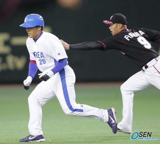 1일 도쿄돔에서 열린 한국 대표팀과 일본 롯데 지바 마린스의 WBC 공식 연습경기는 한국이 이승엽과 김동주의 솔로 홈런을 앞세워 7-2로 승리했다. 6회말 2사 1,2루서 중전 적시타를 친 이승엽이 볼이 홈으로 송구될 것으로 보고 2루로 뛰다 협격에 걸려 1루수 후쿠우라에게 태그 아웃 당하고 있다./도쿄돔=손용호 기자spjj@osen.co.kr [Copyright ⓒ 한국 최고의 스포츠 엔터테인먼트 전문 미디어 OSEN(www.osen.co.kr) 무단전재 및 재배포 금지]