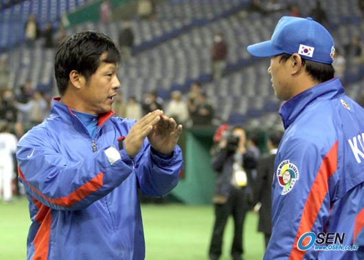 1일 도쿄돔에서 열린 한국 대표팀과 일본 롯데 지바 마린스의 WBC 공식 연습경기는 한국이 이승엽과 김동주의 솔로 홈런을 앞세워 7-2로 승리했다. 경기가 끝나고 구대성과 봉중근이 오늘 피칭에 대해서 의견을 나누고 있다./도쿄돔=손용호 기자 spjj@osen.co.kr [Copyright ⓒ 한국 최고의 스포츠 엔터테인먼트 전문 미디어 OSEN(www.osen.co.kr) 무단전재 및 재배포 금지]