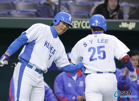 1일 도쿄돔에서 열린 한국 대표팀과 일본 롯데 지바 마린스의 WBC 공식 연습경기는 한국이 이승엽과 김동주의 솔로 홈런을 앞세워 7-2로 승리했다. 1회말 동점 홈런을 친 이승엽을 최희섭이 반갑게 맞이하고 있다. 둘은 2안타씩 치며 승리를 주도했다./도쿄돔=손용호 기자 spjj@osen.co.kr [Copyright ⓒ 한국 최고의 스포츠 엔터테인먼트 전문 미디어 OSEN(www.osen.co.kr) 무단전재 및 재배포 금지]