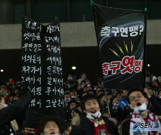 한국-앙골라전이 벌어진 1일 서울 상암 월드컵경기장에서 팬들이 부천 SK가 제주로 연고지를 이전한 것을 성토하면서 프로축구연맹을 비난하는 격문을 스탠드에 걸어 놓고 있다./상암=박영태 기자 ds3fan@osen.co.kr [Copyright ⓒ 한국 최고의 스포츠 엔터테인먼트 전문 미디어 OSEN(www.osen.co.kr) 무단전재 및 재배포 금지]