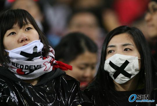 한국-앙골라전이 벌어진 1일 서울 상암 월드컵경기장 관중석에서 팬들이 부천 SK가 제주로 연고지를 이전한 것에 반대하는 의미에서 X표가 그려진 마스크 차림으로 앉아 있다./상암=박영태 기자 ds3fan@osen.co.kr [Copyright ⓒ 한국 최고의 스포츠 엔터테인먼트 전문 미디어 OSEN(www.osen.co.kr) 무단전재 및 재배포 금지]
