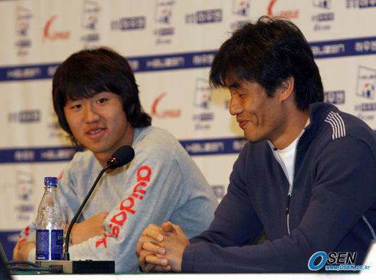 2일 서울 홍은동 그랜드힐튼호텔에서 열린 삼성 하우젠 K-리그 2006 공식 기자회견에서 전북 대표로 참석한 35세의 고참 최진철(오른쪽)의 체력에 대한 질문이 나오자 옆에 있던 울산의 이호가 함께 웃고 있다./박영태 기자 ds3fan@osen.co.kr [Copyright ⓒ 한국 최고의 스포츠 엔터테인먼트 전문 미디어 OSEN(www.osen.co.kr) 무단전재 및 재배포 금지]