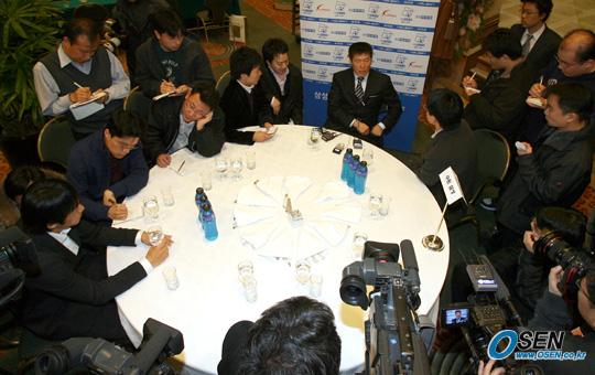 2일 서울 홍은동 그랜드힐튼호텔에서 열린 삼성 하우젠 K-리그 2006 공식 기자회견이 끝난 후 각 구단별 인터뷰 때 취재진들이 수원 삼성의 차범근 감독과 김남일에게 집중적으로 몰려 질문하고 있다./박영태 기자 ds3fan@osen.co.kr [Copyright ⓒ 한국 최고의 스포츠 엔터테인먼트 전문 미디어 OSEN(www.osen.co.kr) 무단전재 및 재배포 금지]