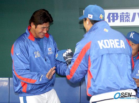 3일 벌어질 2006 WBC 1라운드 대만과의 개막전을 하루 앞둔 2일 한국 대표팀이 도쿄돔에서 마지막 훈련을 실시했다. 서재응이 이승엽이 MP3로 음악을 들으며 춘 춤을 봉중근 앞에서 흉내 내고 있다./도쿄돔=손용호 기자 spjj@osen.co.kr [Copyright ⓒ 한국 최고의 스포츠 엔터테인먼트 전문 미디어 OSEN(www.osen.co.kr) 무단전재 및 재배포 금지]