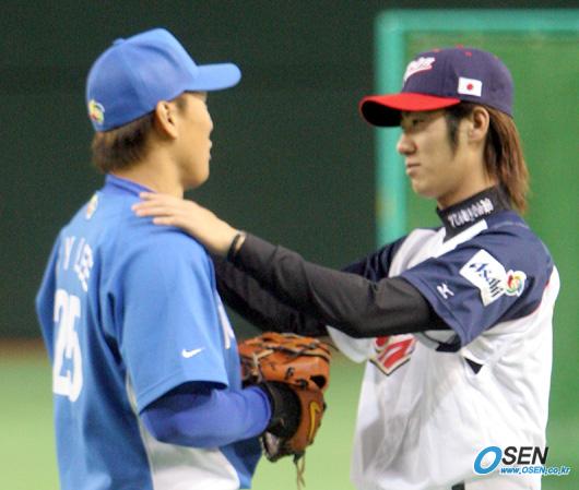 2006 WBC 아시아라운드 개막을 하루 앞둔 2일 출전 4개국이 일제히 도쿄돔에서 마지막 연습을 가졌다. 이승엽이 지난해까지 팀 동료였던 롯데 마린스의 니시오카와 만나 반갑게 인사하고 있다./도쿄돔=손용호 기자spjj@osen.co.kr [Copyright ⓒ 한국 최고의 스포츠 엔터테인먼트 전문 미디어 OSEN(www.osen.co.kr) 무단전재 및 재배포 금지]
