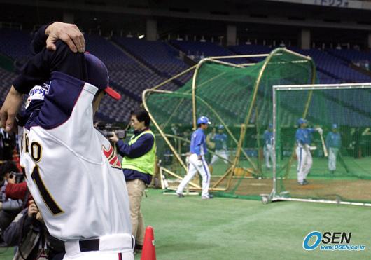2006 WBC 아시아라운드 개막을 하루 앞둔 2일 출전 4개국이 일제히 도쿄돔에서 마지막 연습을 가졌다. 한국에 이어 훈련 스케줄이 잡혀 있던 일본의 이치로가 일찍 나와 스트레칭하며 한국의 훈련 모습을 지켜보고 있다./도쿄돔=손용호 기자 spjj@osen.co.kr [Copyright ⓒ 한국 최고의 스포츠 엔터테인먼트 전문 미디어 OSEN(www.osen.co.kr) 무단전재 및 재배포 금지]
