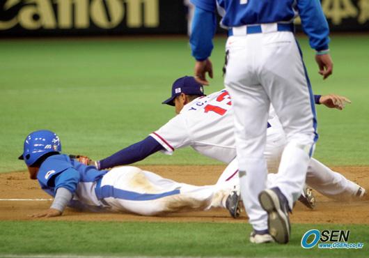 '주루 플레이 이래서는 안된다'. 한국이 3일 도쿄돔에서 벌어진 대만과의 1라운드 개막전에서 2-0으로 완승, 4일 중국에 패하지 않는 한 2라운드에 진출하게 됐지만 아쉬운 점도 있었다. 공격에서 맥을 끊는 플레이들로 끝까지 마음을 졸여야 했다. 앞으로 남은 일본전이나 2라운드 미국 등과의 경기를 위해서도 남아 있는 2% 부족한 점을 조속히 채워야 할 것 같다. . 양팀 득점이 없던 2회 선두 타자 최희섭은 중견수를 넘어 펜스에 직접 맞는 큼직한 2루타로 출루했다. 초반 선취점을 올릴 수 있는 기회였다. 하지만 다음 타자 홍성흔이 친 직선 타구가 대만 유격수 후친룽의 정면으로 가는 순간 최희섭은 2루로 일단 귀루 동작부터 취해야 했으나 도리어 3루를 향해 스타트했다. 뒤늦게 귀루를 시도했으나 이미 볼은 후친룽에서 2루를 밟고 있던 2루수의 글러브에 들어간 다음이었다. 순식간에 2사 주자 없는 상황이 됐고 기회를 놓친 한국은 4회에 가서야 첫 득점에 성공했다. 당시 홍성흔의 타구가 아주 빠른 것도 아니었고 최희섭의 정면으로 날아오고 있었다. 충분히 판단이 가능했고 귀루 할 시간이 있었는데도 주루사를 당하고 말았다. . 한국이 2-0으로 앞서던 8회 이번에는 선두 이종범이 중월 2루타로 기회를 만들었다. 한 점만 더 보태면 쐐기를 박을 수 있는 분위기였다. 이승엽의 2루 땅볼로 1사 3루. 타석의 김재걸이 볼카운트 1-2에서 4구째를 맞을 순간 3루에 있던 이종범이 스타트했다. 하지만 바깥쪽으로 들어온 볼에 잠시 번트 시늉을 냈던 김재걸은 이내 배트를 거둬 들였다.볼을 잡은 대만 포수 예준창이 그대로 3루에 송구했고 이종범은 아웃됐다(사진) 이 장면은 이종범의 주루플레이 미숙보다는 사인에 문제가 있는 것으로 보였다. 이종범이 스퀴즈 사인이 난 것으로 착각했거나 김재걸이 스퀴즈 사인이 났는데도 그냥 보냈을 경우다. 둘 중 어느 경우였든 한국은 귀중한 기회를 날리고 말았다. nanga@osen.co.kr [Copyright ⓒ 한국 최고의 스포츠 엔터테인먼트 전문 미디어 OSEN(www.osen.co.kr) 무단전재 및 재배포 금지]