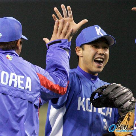 사상 첫 야구 월드컵인 2006 WBC 대회가 3일 도쿄돔서 한국-대만전으로 막이 올라 한국이 효과적인 계투로 2-0 완승을 거두고 사실상 2라운드 진출을 결정지었다. 대만의 9회말 2사 1, 3루서 중전 안타성 땅볼 타구를 다이빙 캐치, 2루수에 토스해 주자를 포스아웃시켜 경기를 끝낸 유격수 박진만이 동료들과 하이파이브를 나누며 기뻐하고 있다./도쿄돔=손용호 기자 spjj@osen.co.k [Copyright ⓒ 한국 최고의 스포츠 엔터테인먼트 전문 미디어 OSEN(www.osen.co.kr) 무단전재 및 재배포 금지]