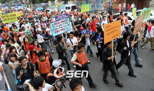 12인의 영화배우 사인회가 번갯불에 콩 볶아먹듯 끝났다. 류승범, 김혜수, 송강호, 이준기, 강혜정, 최민식, 전도연, 설경구, 오달수, 장진영, 엄정화, 공형진 12명의 영화배우들이 7월 1일 서울 광화문 시민열린광장에서 투쟁기금 마련 책 판매 및 팬사인회를 가졌다. 이번 팬사인회는 스크린쿼터 원상회복 및 한미FTA 저지를 위한 결의대회 및 문화제의 일환으로 진행된 행사. 대학로에서 광화문으로의 가두행진이 끝나자마자 진행된 팬사인회는 예정시간을 1시간가량 초과하면서 시작된 지 10여분 만에 끝이 났다. 팬사인회는 시민열린광장의 한켠에 천막으로 마련된 협소한 장소에서 시작됐으며 급히 진행되자 서둘러 모인 팬들로 북새통을 이뤘다. 한꺼번에 들이닥친 팬들로 천막 자체가 흔들거렸을 정도. 진행 요원이 있었음에도 불구하고 갑자기 모여든 팬들을 통제하기에는 역부족. 이에 따라 톱스타들의 사인을 받기 위해 기다렸던 많은 팬들은 사인을 받지 못해 불만을 터뜨리기도 했다. 이날 영화인들이 스크린쿼터 사수를 위해 준비한 행사는 서울 대학로에서 대규모 결의대회를 시작으로 광화문 시민열린광장에서의 사인회 및 문화제로 끝이 났다. 이날 집회는 스크린쿼터 비율을 현행 146일에서 그 절반인 73일로 줄이기로 한다는 영화진흥법 개정안이 7월 1일부터 시행됨에 따른 것. 이에 따라 한미FTA 저지 범국민운동본부 산하 영화인대책위와 문화예술공동위, 교수학술공대위, 금융공대위, 시청각미디어공대위 등은 오후 5시 대학로와 광화문에서 스크린쿼터원상회복 및 한미FTA 저지를 위한 집회 및 문화제 ‘참여정부엔 국민이 없다’를 개최했다. orialdo@osen.co.kr 스크린쿼터 사수를 위해 피켓들고 가두행진하는 영화인들/박영태 기자 ds3fan0@osen.co.kr