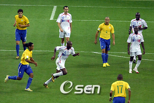 프랑스가 2일(한국시간) 새벽 프랑크푸르트에서 벌어진 2006 독일 월드컵 8강전서 강력한 우승후보인 브라질에 티에리 앙리의 한 방으로 1-0으로 승리하는 파란을 일으켰다. 후반전 종료 시간이 다 된 상황서 서 브라질의 호나우두(7번) 등이 경기를 포기한 듯 비에라의 드리블에 적극적으로 대응하지 않고 있다./ 프랑크푸르트=송석린 기자song@osen.co.kr