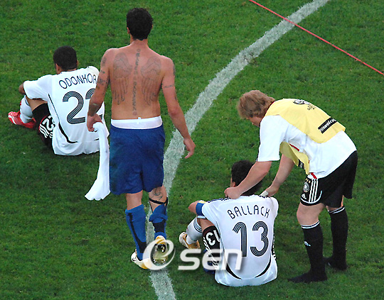 이탈리아가 5일(이하 한국시간) 새벽 도르트문트 베스트팔렌 슈타디온에서 열린 2006 독일 월드컵 4강전에서 연장 후반 14분 파비오 그로소의 결승골과 인저리타임에 알레산드로 델 피에로의 쐐기골로 독일을 2-0으로 꺾고 결승에 선착했다. 이번 대회서 벤치만 짘켰던 골키퍼 올리버 칸이 경기 후 그라운드에 주저앉아 있는 주장 미하엘 발락을 위로해 주고 있다./도르트문트=송석린 기자song@osen.co.kr