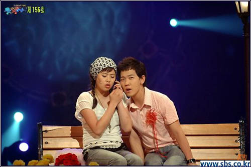 한지형의 눈시울이 붉어졌다. 마지막까지 웃음기는 잃지 않았지만 김범용의 눈가에도 언뜻언뜻 이슬이 맺혔다. ‘웃음을 찾는 사람들’(연출 박상혁, 이하 웃찾사)의 공개 녹화장을 찾은 1200여 관객들은 뜨거운 박수로 이들과 이별을 아쉬워했다. 지난 7개월간 누나와 연하남의 토닥거리는 연애일기로 팬들의 많은 사랑을 받았던 SBS TV ‘웃찾사’의 인기 코너 ‘누구야’가 7월 7일 마지막 녹화를 했다. 작년 12월 ‘누구야’는 6개월간의 준비 끝에 탄생했다. SBS 개그 공채 6기인 김범용과 공채 8기인 한지형이 콤비를 이뤄 연하남과 연상녀의 알콩달콩 사랑 만들기를 개그로 꾸몄다. 이들은 이승기의 ‘내 여자라니까’, 현영의 ‘누나의 꿈’ 등과 더불어 대중문화에서 표현되고 있는 ‘누나 신드롬’의 한 축을 담당했다. 개그에서는 한지형이 누나 역을, 김범용이 누나의 일거수일투족을 참견하는 연하남 역을 맡았지만 실제로는 김범용이 한참 위다. 김범용은 올해 서른 살이고 한지형은 겨우 스물 두 살이다. 그러나 거꾸로 된 나이차가 둘의 앙상블에 장애가 되지는 못했다. 오히려 이 코너가 진행되면서 “둘이 실제 커플 아니냐”는 오해를 살만큼, 잘 어울리는 한 쌍의 ‘연상녀-연하남 커플’이었다. 김범용은 “개그 소재를 얻기 위해 미사리 카페촌이나 서울 시내 유명 데이트 장소를 찾아 다녔다. 실제 커플들이 하는 행동과 생각들을 알아야 했기 때문이다. 이런 모습을 본 팬들이 오해를 하는 것이 당연한 건지도 모른다”고 고개를 끄덕였다. “누나를 따르는 현상은 이제 어디에서도 낯설지 않다”는 김범용은 “대부분의 남자들이 그렇듯이 실제로 6살 연상의 누나를 쫓아 다닌 적도 있고 2살 연상의 여인과 사귄 적도 있다. 귀여운 동생뻘 남자가 스토커가 된다면 누나도 별로 기분 나쁘지는 않을 것 아니냐”고 미소 지었다. 수더분한 얼굴 탓에 누나 역을 맡아야 했던 한지형도 “평소 청바지를 즐겨 입는 발랄한 성격의 소유자이지만 이 개그를 하면서 롱스커트를 입고 조신한 여자가 돼야 했다. 하지만 지난 7개월이 나에게는 행운이 따랐던 기간이고 행복했던 시간이다”고 소감을 말했다. 김범용에게 ‘누구야’는 각별한 의미로 다가온다. 2001년 공채 6기로 남들 웃기는 직업을 시작해 4년여를 무명으로 보내야 했기 때문이다. 이름 석자를 제대로 알리는데 5년이라는 세월이 흘렀다. “‘누구야’라는 코너를 6개월을 준비해 올렸고 7개월 동안 팬들의 사랑을 받았다. 4년여를 기다린 보람을 지난 7개월 동안에 한꺼번에 얻었다”고 행복한 미소를 짓는 김범용이다. ‘누구야’의 마지막 녹화는 둘의 행복한 결혼으로 결말을 내렸다. 김범용 한지형이 각자 준비하고 있는 새 코너도 머지않아 팬들의 사랑을 받게 될 것이라는 약속도 함께 하면서 말이다. 100c@osen.co.kr 7일 마지막 녹화를 마친 ‘웃찾사’의 ‘누구야’ 코너. /SBS 제공.