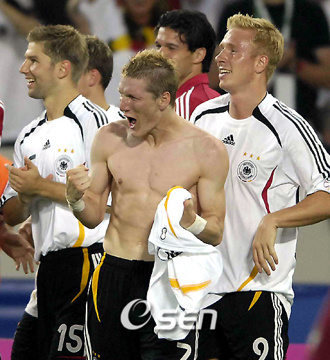 독일은 9일(한국시간) 독일 슈투트가르트 고트리브 다임러 슈타디온에서 가진 2006 독일 월드컵 3~4위전에서 슈바인슈타이거의 2골과 상대의 자책골을 묶어 누누 고메스가 1골을 만회하는 데 그친 포르투갈을 3-1로 완파, 3위를 차지했다. 후반 슈바인슈타이거가 자신의 두 번째 골을 넣고 웃 옷을 벗고 환호하고 있다. /슈투트가르트=송석린 기자song@osen.co.kr