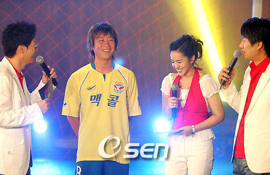 8일 서울 올림픽 공원 펜싱경기장에서 KBS 특집 ‘태극전사 최강전’ 녹화가 태극전사 이운재 송종국 김남일 김영철 김상식 김용대 김두현 조원희가 참가한 가운데 열렸다. 박지윤 아나운서의 김두현 팬이라는 말에 남희석이 김두현을 박지윤 아나운서 옆 자리로 옮기자 함께 웃고 있다. 두 사람은 녹화 내내 서로의 팬임을 자처, 분위기를 돋구었다./올림픽공원=손용호 기자spjj@osen.co.kr