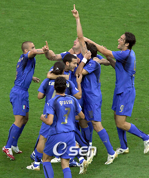 이탈리아가 10일(한국시간) 새벽 베를린 올림피아 슈타디온에서 가진 2006 독일 월드컵 결승전에서 프랑스와 연장전까지 1-1로 비긴 뒤 승부차기서 5-3으로 승리, 이탈리아축구협회 문장에 네 번째 별을 달았다. 전반전 마테라치가가 헤딩 동점골을 넣은 뒤 이탈리아 선수들이 한데 엉켜 기쁨을 나누고 있다./베를린=송석린 기자song@osen.co.kr