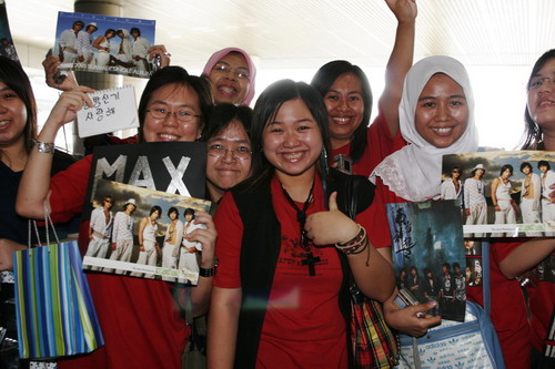 동방신기가 팬들의 환호를 받으며 말레이시아에 입성했다. 7월 14일 말레이시아 쿠알라룸프르의 Putra Indoor Stadium에서 펼쳐지는 ‘Rising Sun 1st Asia Tour 2006 Live In Malaysia’ 콘서트를 위해 12일 말레이시아를 방문한 동방신기는 공항에서 팬들의 열광적인 환대를 받아 인기를 실감했다. 말레이시아 현지 팬들은 동방신기가 도착하기 3시간 전부터 공항에 몰려들었으며 동방신기를 상징하는 붉은 색의 티셔츠와 펄레드 풍선을 흔들며 기다렸다. 또한 동방신기 멤버들의 이름과 사진으로 만든 다양한 플래카드를 높이 든 채 ‘One’, ‘HUG’ 등 히트곡들을 한국말로 따라 부르는 모습을 연출해 공항 보안요원과 직원들의 눈길을 끌었다. 특히 말레이시아는 이슬람 문화권 국가인 관계로 머리에 전통의상인 히잡을 두른 여성 팬들이 눈에 많이 띄었는데 히잡을 쓴 채 붉은 티셔츠를 입고 풍선을 흔들며 동방신기를 연호하는 모습이 상당히 이색적이었다. 말레이시아에 도착한 동방신기 멤버 유노윤호는 "펄 레드 풍선을 들고 히잡을 두른 팬들의 모습이 매우 인상적이었다. 14일에 있을 콘서트도 너무 기대되고 열심히 해야겠다는 생각이 든다"며 입국현장에서의 뜨거운 환영인파에 감사의 뜻을 전했다. 동방신기는 말레이시아 팬들의 폭발적인 환호에 웃음으로 화답했으며 동방신기를 보고 흥분한 팬들로 인해 공항 입국 게이트를 보호하고 있던 바리게이트가 파손되는 해프닝이 발생하기도 해 일대 혼잡을 이루기도 했다. 동방신기는 13일 말레이시아 쿠알라룸프르의 한 호텔에서 ‘Rising Sun 1st Asia Tour 2006 Live In Malaysia’ 콘서트 기자회견을 가지며 하루 앞으로 다가온 콘서트 리허설에 전력을 쏟을 계획이다. hellow0827@osen.co.kr 동방신기 상징인 붉은 티셔츠를 입고 히잡을 두른 말레이시아 팬들. /SM 엔터테인먼트 제공.
