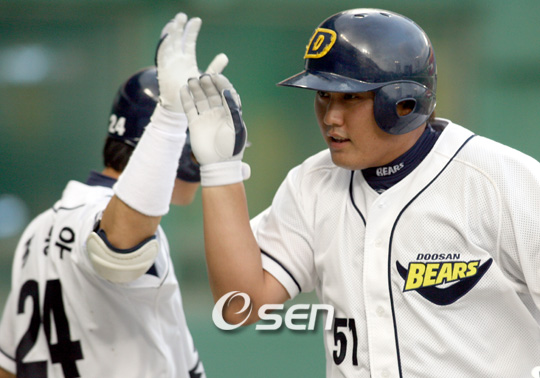 13일 잠실구장에서 열린 2006 삼성 PAVV 프로야구 두산 베어스와 현대 유니콘스의 경기 두산의 1회말 2사 2루에서 4번타자 최준석이 좌중월 선제 2점 홈런을 날리고 홈인한 뒤 대기 타석으로 나오던 6번 타자 강동우와 하이파이브하고 있다. 둘은 시즌 중 각각 롯데와 삼성에서 이적한 뒤 좋은 활약을 보이고 있다./잠실=박영태 기자 ds3fan@osen.co.kr