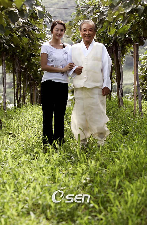 오는 24일 첫 방송되는 KBS 2TV 새 월화 드라마 '포도밭 그 사나이' 제작현장공개행사가 13일 오후 충북 영동군 황간면의 포도밭에서 열렸다. 포도밭 주인인 윤은혜의 당숙 할아버지 이순재가 창업자금을 마련하기 위해 시골로 농사 지러 온 철없는 도시 처녀 윤은혜와 포도나무 사이에서 다정한 포즈를 취하고 있다./주지영 기자 jj0jj0@osen.co.kr