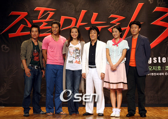 영화 '조폭 마누라3'의 촬영현장 공개 행사가 14일 경기도 남양주에 있는 한국 종합 영화 촬영소에서 열렸다. '조폭 마누라3'에는 중국배우 서기와 이범수 현영 오지호 조희봉 등이 출연한다. 촬영현장 공개후 가진 포토타임에서 출연진들이 포즈를 취하고 있다.(왼쪽부터 조희봉, 오지호, 서기, 이범수, 현영, 조진규 감독)./남양주=박영태 기자 ds3fan@osen.co.kr