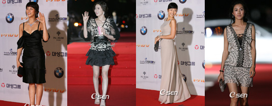 제43회 대종상영화제가 화려하게 막을 올린 가운데 올해에도 여배우들의 드레스가 관객과 대중의 시선을 사로잡았다. 올해 대종상은 7월 21일 서울 강남구 삼성동 무역센터 코엑스 컨벤션홀에서 개최됐다. 영화제의 또 다른 묘미를 느끼게 해주는 레드카펫을 그 어느 때보다도 열광케 만든 건 역시 여배우들의 화려한 드레스였다. 올해 대종상에서 여배우들의 드레스코드는 대체로 블랙 & 화이트다. 많은 여배우들이 블랙 또는 화이트 계열의 드레스로 맵시를 뽐냈다. 블랙 & 화이트 색상은 세련미와 우아한 분위기를 연출한다는 점에서 많이 사랑받는 컬러다. 김아중 김옥빈 최정원 추자현 등이 블랙 계열의 드레스를 입었으며 김혜수 강성연 이요원 장진영 등이 화이트 계열의 드레스를 입었다. 한편 공현주 등은 정열적인 레드 드레스로 눈길을 끌었다. 또 디자인 측면에서 여배우들의 드레스는 롱길이와 미니길이의 드레스로 크게 나누어진다. 롱길이의 드레스는 대체로 몸의 실루엣이 드러나는 피트되는 스타일이 많았고 미니길이의 드레스는 스커트 길이가 짧은 만큼 여배우들의 각선미가 눈길을 끌었다. 김혜수 강성연 현영 등이 롱 드레스로 맵시를 뽐냈고 추자현 최정원 이요원 등이 미니 길이의 드레스를 선보였다. 제43회 대종상영화제는 방송인 유정현, 탤런트 이보영의 사회로 오후 8시 55분부터 2시간 넘게 진행됐으며 가수 세븐과 바다가 축하무대를 꾸몄다. orialdo@osen.co.kr 왼쪽부터 김옥빈 최정원 장진영 이요원.