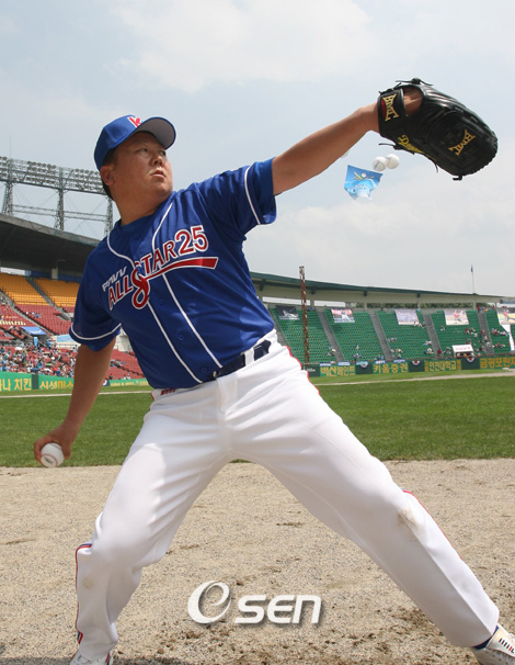 작년 만큼은 아니지만 올해도 역시 ‘국보급 투수’출신 다운 실력을 발휘했다. 선동렬(43) 삼성 감독이 22일 잠실구장에서 열린 프로야구 25주년 기념 삼성 PAVV 프로야구 올스타전 식전행사의 일환으로 개최한 프로야구 25년 올드스타와 연예인 야구팀 ‘한(恨)’과의 경기에서 선발 등판, 1이닝 무실점의 퍼펙트 투구를 과시했다. 지난해 올드스타전에서 기록했던 최고 스피드 140km에는 못미친 134km에 그쳤으나 컨트롤은 여전했다. 선 감독은 1회초 톱타자 이휘재와의 대결에서는 이휘재의 선방에 막혀 2-3 풀카운트에 8구까지 가는 접전(?)을 벌인 끝에 삼진을 잡았다. 다음 타자 윤종신은 3루 파울 플라이로 처리하며 투구감을 잡은 선 감독은 연예인 팀 3번타자 허준호를 3구 삼진으로 요리하는 기염을 토했다. 선 감독은 이휘재와의 대결 초반에는 120km대 중반의 볼스피드를 기록했으나 갈수록 스피드를 높혀 최고구속 134km까지 끌어올렸다. 스피드는 현역시절 150km대의 강속구를 뿌릴 때보다는 훨씬 못미쳤으나 컨트롤은 여전히 ‘칼날’이었다. 좌우 코너워크는 현역 투수들 못지 않은 실력을 뽐냈다. 현역 때처럼 볼도 묵직해 연예인 아마추어 선수들이 알루미늄 배트로 쳐도 내야를 벗어나지 못했다. 방망이가 밀렸다. 경기 전 불펜 투구때 공을 받은 유승안 전 한화 감독이 “선 감독, 오늘 140km 넘겠다”고 덕담을 하자 선 감독은 “어이구 그런 소리 마세요. 130km나 나오면 다행입니다”라며 손사래를 쳤다. 한편 연예인팀의 6번 타자로 야구선수 출신인 김C는 0-2로 뒤진 2회 1사 1루에서 선동렬 감독에 이어 구원 등판한 ‘불사조’ 박철순으로부터 우월 적시 3루타를 터트리는 기염을 토하기도 했다. sun@osen.co.kr
