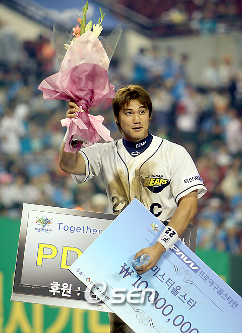 영예의 미스터 올스타로 뽑힌 홍성흔(29, 두산)은 특유의 호쾌한 미소를 지으며 "여러분께 고맙습니다"는 말을 연발했다. 22일 잠실에서 열린 2006 삼성 PAVV 프로야구 올스타전에서 2회 선제 투런홈런 포함 3타수 3안타 2타점을 기록한 홍성흔은 경기 MVP에 선정됐다. "언제 MVP를 직감했느냐"는 질문에 그는 "첫 타석에서 홈런을 친 뒤 '이제는 수비에 신경을 써야겠구나'라고 생각했다"며 넉살을 떤 뒤 "(장)원준이가 워낙 잘 던져서 끝까지 마음을 놓지 못했다"고 말했다. 이날 부상으로 1000만 원을 받은 그는 상금 전액을 수재의연금으로 기탁할 예정이다. "어떤 선수가 MVP를 받더라도 같은 행동을 했을 것"이라던 그는 "어릴 때부터 미스터 올스터로 선정된 선배들을 부러운 마음으로 지켜보기만 했는데 드디어 꿈이 이루어진 것 같다"고 감격해 했다. 이날 홍성흔은 수비에서도 한껏 빛을 발했다. 동군 포수로서 6이닝 동안 서군 타선을 퍼펙트로 틀어막는 데 일등공신이 됐다. "타자들 타격감이 좋지 않은 것 같아 직구 위주로 유도한 게 효과를 본 것 같다"는 게 나름대로의 분석이다. 홍성흔은 이날 오후 심상치 않은 꿈을 꿨다고 한다. 잠시 낮잠을 자는 순간 꿈에 박찬호(33.샌디에이고)가 나타나서 이상한 행동을 하더라는 것. "그간 왜 연락이 없었느냐"고 한 박찬호는 홍성흔에게 이상한 종이에 금가루를 담아 자신에게 건넸고 이를 받아든 자신이 금가루를 단숨에 먹어치웠다는 것이다. 소속팀 두산의 안방을 책임지고 있는 두산은 "나서지 않고 뒤에서 선수들을 독려하는 데 주안점을 두겠다"고 후반기 각오를 밝힌 뒤 덕아웃으로 사라졌다. workhorse@osen.co.kr