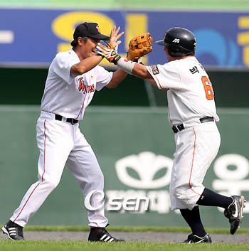 인기 시사만화 ‘광수생각’의 만화가 박광수가 연예인 야구 올스타 팀의 자존심을 지켰다. 박광수는 7월 23일 인천 문학구장에서 벌어진 ‘연예인 올스타-SK 와이번스 코칭스태프 수재민 돕기 자선 경기’에서 팀의 자존심을 살린 지각 타점을 올리는 주인공이 됐다. 그것도 보기에도 시원한 좌월 투런포였다. 이 활약으로 박광수는 대회 MVP를 수상해 상금 200만 원을 타기도 했다. 박광수가 소속된 연예인 올스타 팀은 3회까지 SK 코칭스태프 팀의 선발 투수 성준의 노련한 투구에 막혀 단 한 개의 안타도 기록하지 못하고 있었다. 올스타 팀이라는 이름이 부끄러워질 상황. 반면 SK는 김기태 김성래 장재중 송태일 등 현역 냄새가 채 가시지 않은 젊은 코칭스태프로 선발 라인업을 구성해 가볍게 점수를 뽑아갔다. 승부가 일방적으로 흘러 친선 게임이라는 취지가 무색해지려는 시점에 최일언 투수 코치가 ‘X맨’을 자처했다. 마운드에 오른 최 코치는 연예인 팀 타자들에게 ‘배팅볼’을 뿌리기 시작했다. 배경이야 어떻든 행운의 주인공은 있기 마련. 0-4로 뒤지던 4회초 타석에 들어선 강용석이 연예인 팀의 첫 안타를 만들어 내고 이어 박광수가 육중한 몸매에서 우러나는 묵직한 방망이를 휘두르며 좌월 투런 홈런을 터트렸다. 연예인 야구팀 ‘조마조마’의 감독이기도 한 박광수는 “최 코치님이 일부러 치기 좋게 던져줬다. 어쨌든 홈런을 기록해 정말 영광이다”고 소감을 밝혔다. 최일언 SK 투수코치는 실전에서 마운드에 선 것이 13년 만이라고 인터뷰에서 밝혔다. 연예인 올스타팀은 6회 3점을 간신히 뽑아 내 5-5, 무승부로 경기를 마쳤다. 100c@osen.co.kr 박광수가 투런 홈런을 친 뒤 SK 최태원 코치의 축하를 받으며 3루를 돌고 있다. /문학=박영태 기자 ds3fan@osen.co.kr