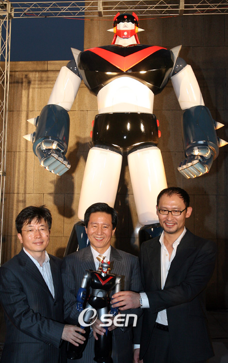 로보트 태권V 탄생 30돌을 축하하는 기념 행사가 7월 24일 예술의 전당 한가람 미술관에서 열렸다. (주)로보트 태권V와 (주)나무액터스의 매니지먼트 조인식이 끝난 후 신철 로보트 태권V 대표, 이재훈 산업자원부 산업정책 본부장, 김종도 나무액터스 대표가 로보트 태권V 조형물 앞에서 기념촬영을 하고 있다./박영태 기자 ds3fan@osen.co.kr