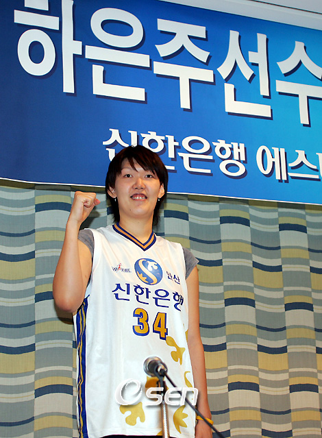 하승진의 누나 하은주(23, 202cm)가 연봉 1억 2000만 원에 안산 신한은행에 입단했다. 신한은행과 하은주는 1일 서울 명동 로얄호텔에서 입단 기자회견을 갖고 연봉 1억 2000만 원에 5년간 계약했다고 밝혔다. 이로써 지난 6월 국적 회복을 선언했던 하은주는 여자프로농구 2007 겨울리그부터 신한은행의 유니폼을 입고 뛰게 됐으며 신한은행은 앞으로 들어올 용병과 기존의 강영숙-강지숙 등 국내 센터진과 함께 6개 구단 최고의 높이를 구축하게 됐다. 이날 하은주는 일본 샹송화장품에서 달았던 33번 대신 일본 시절보다 더 좋은 활약을 펼치겠다는 의지의 표시로 등번호 34번을 선택했다. 하은주는 입단 기자회견에서 "다시 한국에 오는 것을 환영해줘 감사하고 기대에 어긋나지 않게 처음부터 다시 배워나가는 자세로 열심히 하겠다"며 "일본에서 한국에 돌아온 후 어느 팀에서 뛰는 것이 좋을지 생각하면서 TV를 통해 플레이오프를 지켜봤는데 (전)주원이 언니의 플레이가 너무나 매력적이어서 신한은행을 선택했다"고 밝혔다. 국적 회복 절차를 밟고 있다는 하은주는 "일본 귀화는 농구를 버릴 수가 없어서 어쩔 수 없이 선택했던 것"이라며 "미국 여자프로농구 진출건은 신한은행에서 전적으로 도와준다고 했지만 신한은행에 온 이상 최선을 다해 팀 전력 강화에 기여하고 싶다"고 말했다. 한편 일본 샹송화장품에서 활약하던 하은주가 신한은행에 입단함으로써 포틀랜드 트레일 블레이저스에서 밀워키 벅스로 이적한 동생 하승진과 함께 같은 날 새로운 팀에서 다음 시즌을 맞이하게 됐다. tankpark@osen.co.kr 주지영 기자 jj0jj0@osen.co.kr