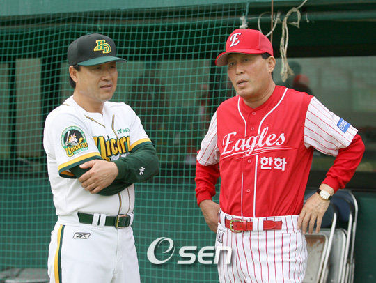 신기할 정도다. 마치 짜기라도 한 듯 비슷한 행보를 보인다. 올 시즌 꾸준히 상위권을 유지하고 있는 한화 이글스와 현대 유니콘스가 ‘닮은꼴 행보’로 눈길을 끌고 있다. 두 팀은 상승세를 탈 때도 부진에 빠질 때도 비슷하게 움직이고 있다. 한화가 연승 행진을 벌이면 현대도 연승을 거두고 현대가 부진에 빠지면 한화도 연패에서 헤맨다. 그 결과가 2일 현재 반게임 차 2, 3위다. 한화는 최근 5연승으로 5연패에 빠진 선두 삼성을 4게임 차로 압박하며 2위를 마크하고 있고 최근 3연승 중인 현대는 한화에 반 게임 차로 뒤진 3위를 달리고 있다. 현대와 한화는 시즌 초반부터 줄곧 작은 승차를 유지하며 앞서거니 뒤서거니 하면서 선두부터 3위까지를 오르내리고 있다. 양팀의 월별 승패를 살펴보면 ‘닮은꼴 행보’를 한 눈에 알 수 있다. 4월에는 나란히 10승 9패로 동률을 이룬 현대와 한화는 5월 파죽지세의 상승세를 타며 선두를 주고 받았다. 5월 현대가 9연승 포함 16승 7패로 선두를 달렸고 한화가 15승 1무 7패로 바짝 뒤를 추격했다. 6월로 접어 들면서 양팀은 상승세가 한 풀 꺾이며 주춤했다. 현대는 6월 성적이 8승 1무 14패로 저조했고 한화는 10승 12패로 5할 승부를 기록하지 못했다. 양팀이 주춤하는 사이 3위를 유지하던 삼성이 선두로 뛰쳐올랐다. 전반기 막판인 7월 중순까지도 힘을 쓰지 못하던 한화와 현대는 후반기 들어 페이스를 회복하며 승률을 끌어올리고 있다. 한화는 7월 이후 최근 5연승 포함 7승 1무 5패, 현대는 3연승 포함 9승 5패로 분전하며 중위권에 포진한 두산과 KIA의 추격을 뿌리치고 다시 선두를 향해 달려가고 있다. 이처럼 양팀의 행보가 비슷하다 보니 승차가 좀처럼 벌어지지 않은 채 선두 경쟁을 벌여 팬들의 흥미를 끌고 있다. 양팀의 최근 상승세로 선두 삼성이 일찌감치 도망가고 나머지 4개팀이 혼전을 벌일 것으로 예상되던 후반기가 ‘선두 3강’의 치열한 1위 싸움으로 번질 조짐이다. 올 시즌 '빈볼 시비'로 주먹다짐까지 벌여 사이는 별로 좋지 않으면서도 쌍둥이처럼 붙어다니고 있는 한화와 현대가 언제쯤 승차를 벌리며 떨어져나갈지 흥미롭다. 양팀간 전적도 한화가 6승 5패로 약간 앞설 뿐 팽팽하다. sun@osen.co.kr 김인식 한화 감독과 김재박 현대 감독이 수원 경기에 앞서 만나 이야기를 나누고 있다.