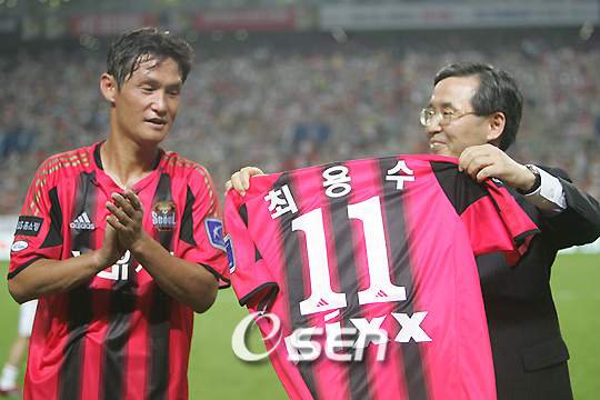 "가족들이 큰 힘이 돼줬고 팬들의 사랑으로 행복한 선수 생활을 했다". 서울 상암 월드컵 경기장에서 5일 열린 FC 서울과 FC 도쿄의 친선경기를 끝으로 축구화를 벗고 지도자 생활에 전념하는 '독수리' 최용수(33)가 25년동안 이어졌던 자신의 선수생활에 대해 만족감을 드러냈다. 이날 경기를 끝으로 플레잉코치에서 코치로 변신하는 최용수는 경기가 끝난 뒤 가진 기자회견에서 "어릴 때 좋지 않은 환경 속에서도 오로지 축구 하나에만 빠져 한 길을 걸어왔다"며 "힘든 시기도 있었고 좋은 시절도 있었지만 부모님을 비롯한 가족들의 성원과 팬들의 사랑으로 행복한 선수생활을 했다"고 말했다. 지난 1979년 부산 금정초등학교 3학년때 선수생활을 시작해 연세대를 거쳐 지난 1994년 FC 서울의 전신인 안양 LG에 입단했던 최용수는 1996년 애틀랜타 올림픽과 1998년 프랑스 월드컵에 출전하며 대형 스트라이커로 각광을 받았다. 이후 2002년 한일 월드컵에 출전했고 일본에서 활약한 최용수는 올 시즌 시작과 함께 FC 서울로 복귀하면서 플레잉코치로 활약했지만 정규리그에서 2경기만 뛴 뒤 지도자 수업 준비를 해왔다. 이날 경기 하프타임 때 공식 은퇴식을 가진 최용수는 은퇴 동기를 묻는 질문에 "우리 팀에는 좋은 유망주가 많기 때문에 한 걸음 물러서서 후배들에게 기회를 주면서 조언도 주는 역할을 하고 싶었다"며 "후회없는 선수생활을 했다고 생각했기 때문에 은퇴를 결심했다"고 답했다. 이어 자신의 계보를 이을 공격수를 꼽아 달라는 기자들의 질문에 최용수는 "언론에서 내가 스트라이커의 계보를 이었다는 표현을 쓰는데 그건 과찬"이라며 "굳이 꼽는다면 정조국은 갖고 있는 무기가 많은 좋은 선수고 박주영도 나이에 비해 장점이 많지만 한 단계 업그레이드가 필요하다"고 말했다. 한편 이장수 감독은 경기 후 가진 기자회견에서 "포항과 FA컵을 치르고 나서 선수들이 지쳐있는 상태였지만 최용수의 은퇴경기라 좋은 결과가 나올 수 있도록 모두 열심히 뛰어줬다"며 "김치곤과 김은중을 투입하려고 했지만 포항전에서 부상을 당해 일부러 출전시키지 않았고 6명을 고루 기용하며 선수들을 테스트했다"고 말했다. 또 이 감독은 "두두가 영입되면서 공격 다변화가 가능해졌다. 특히 두두는 좌우를 가리지 않는 선수이기 때문에 상대팀에 따라 포지션을 바꿔 기용할 수 있을 것"이라며 '영입 용병' 두두에 대한 강한 기대감을 드러냈다. tankpark@osen.co.kr 최용수가 이완경 서울 사장에게 유니폼을 반납하고 있다./상암=손용호 기자spjj@osen.co.kr