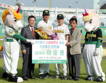 현대 '캡틴' 이숭용(35)이 개인통산 2000루타 달성 시상식을 가졌다. 한국야구위원회(KBO) 하일성 사무총장은 6일 수원구장 KIA전에 앞서 이숭용의 2000루타 달성 기념 트로피를 전달했다. 또 현대 구단은 300만원 상당의 순금 30돈쭝 야구공모양의 트로피와 꽃다발을 건네며 축하했다. 이숭용은 시상식후 "2000루타 오기까지 팀동료, 코칭스태프, 그리고 프런트의 도움이 없었다면 불가능했을 것이다. 3000루타 달성까지 최선을 다하겠다"고 소감을 밝혔다. 이숭용은 지난 6월 28일 수원 LG전에서 프로통산 22번째로 2000루타를 달성했다. 이숭용이 시상식후 하일성 KBO 총장, 정재호 현대 단장 등과 기념사진을 찍고 있다. /현대 유니콘스 제공 sun@osen.co.kr