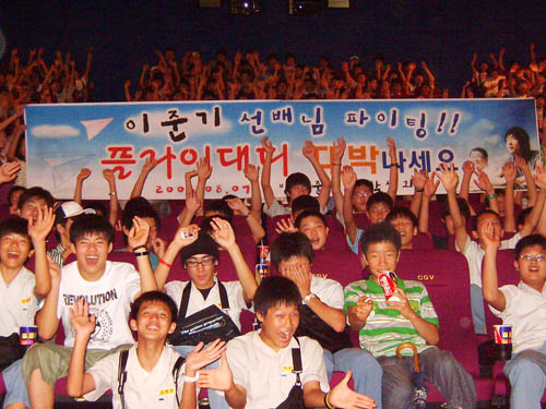 팬 카페의 주선으로 모교 후배들이 영화 ‘플라이 대디’를 단체 관람하게 된 데 대해 이준기가 팬 카페 회원들에게 감사의 뜻을 전했다. 이준기의 팬 모임 중의 하나인 팬 카페 ‘준스레이디’는 8월 7일 이준기가 졸업한 창원 반송중학교 재학생을 대상으로 창원 CGV에서 단체 관람을 실시했다. 반송중학교 전교생 1100명의 단체관람 비용 일체를 준스레이디에서 부담해 이준기 주연 영화 ‘플라이대디’의 대박을 기원했다. 이 행사를 주관한 준스레이디의 공동운영자 박소윤 씨는 “반송중학교 학생들이 선배가 출연한 영화의 대박을 기원하는 의미를 담은 플래카드를 제작했고 또 영화 상영 전에는 다 함께 환호성을 질러 이준기 씨를 응원했다”고 전했다. 이어 박 씨는 “이준기 씨가 주연해 유명해진 영화이기는 하지만 막상 영화를 보고 나니까 부모의 사랑을 강조한 작품이더라. 아버지와 자녀가 함께 보기에 정말 좋은 영화라는 생각이 들었다”고 말했다. 준스레이디의 제안을 흔쾌히 받아들인 창원 반송중학교 정권섭 교감도 “이번 전체관람을 계기로 학생들이 선배 이준기와 학교에 더 큰 자긍심을 가졌으면 좋겠다. 앞으로 기회가 된다면 이준기가 모교에도 꼭 한번 방문해 줬으면 한다”고 밝혔다. 때마침 영화 홍보차 부산을 방문하고 있던 이준기도 모교 후배들을 대상으로 한 영화 단체관람이 무사히 끝났다는 소식을 듣고 “내가 해야 할 일을 팬들이 대신 해 줘 뭐라 감사의 말을 전해야 할지 모르겠다”고 준스레이디에 인사했다. 100c@osen.co.kr ‘플라이대디 대박 나세요’라는 문구가 적힌 플래카드를 걸어 놓고 단체 관람을 준비하고 있는 창원 반송중학교 학생들.