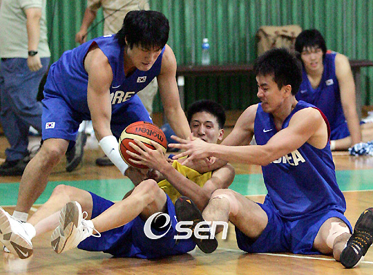 오는 11일부터 서울 잠실체육관서 벌어질 월드바스켓볼챌린지 2006에 출전할 한국 남자농구 대표팀이 8일 오후 태릉선수촌 다목적체육관에서 청소년대표팀과 5쿼터 연습경기를 가져 139-110으로 이겼다. 국가대표를 겸하고 있으나 이날 청소년대표팀 소속으로 뛴 김진수의 볼을 조우현(왼쪽)과 김성철(오른쪽)이 양쪽에서 빼앗으려 하고 있다./태릉=주지영 기자 jj0jj0@osen.co.kr