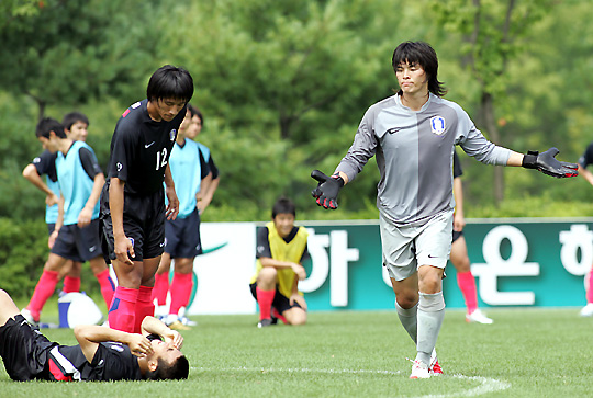 지난 6일 파주 NFC에 소집된 베어벡호 1기 선수들이 아시안컵 예선 대만전 엔트리 발표를 몇 시간 앞둔 10일 오전 뜨거운 햇살 아래 훈련을 소화했다. 7명씩 4개조로 나누어 치른 미니게임에서 골키퍼 김영광이 자신과 충돌해 그라운드에 누워 있는 조원희를 보며 '아무 일도 없었다'는 듯한 제스처를 취하고 있다./파주=손용호 기자spjj@osen.co.kr