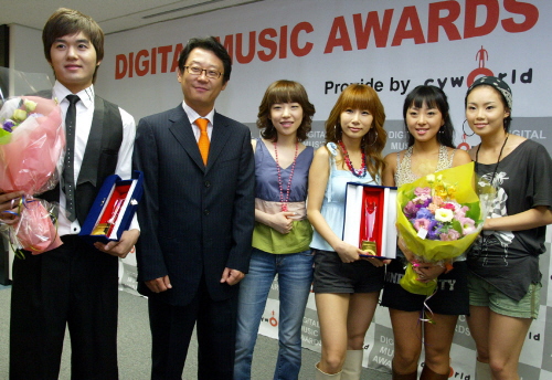 여성그룹 브라운아이드걸스와 조PD가 함께 부른 'Hold The Line'이 디지털뮤직어워드를 처음으로 수상하는 영광을 얻었다. 제 1회 디지털뮤직어워드 시상식을 개최한 (주) SK 커뮤니케이션즈에 따르면 지난 한 달간 가장 많은 다운로드 판매순위를 기록한 곡에게 수여하는 ‘Song of The Month’로 브라운아이드걸스의 ‘Hold The Line’가 선정됐다. ‘Hold The Line’은 현재 6주 연속 싸이월드 BGM 순위 1위에 랭크돼 있고 한 달간 17만 건의 BGM 다운로드 건수를 기록했다. 브라운아이드걸스는 “신인으로서 처음 받는 상이라 많이 떨리고 영광스럽다”고 수상소감을 밝히고 기쁨을 감추지 못했다. 첫 앨범을 발매하는 신인 중 최고의 판매를 보인 신인에게 주어지는 ‘New of The Month’에는 ‘봄,여름,가을,겨울’을 부른 신인가수 수호가 수상했다. SK 커뮤니케이션즈의 한 관계자는 “국내뿐만 아니라 전 세계적으로도 처음 개최되는 이번 디지털뮤직어워드(Digital Music Awards)를 통해 유능하고 능력 있는 신인을 발굴하고 지원하겠다”고 발표했다. 신인가수 수호, 싸이월드 이승훈 본부장, 브라운아이드걸스 가인,제아,나르샤,미료(왼쪽부터)/내가네트워크 제공.