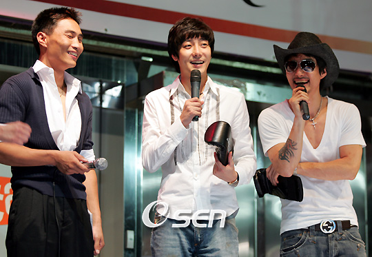 오는 9월 16일 장충체육관에서 벌어지는 K-1 파이팅 네트워크 KHAN 2006 in seoul 대회서 이종격투기 데뷔전을 치를 전 프로복싱 WBA 세계챔피언 최용수가 11일 저녁 서울 동대문 두산타워 야외 무대에서 출정식을 가졌다. 자신을 위해 곡을 만들어준 인기 듀오 듀크에게 글러브를 선물하자 듀크가 "하나씩만 낄게요"라며 웃고 있다./주지영 기자 jj0jj0@osen.co.kr