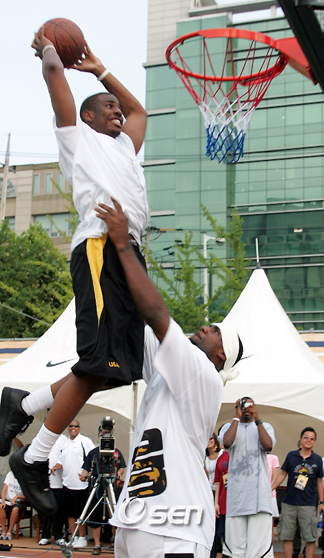 '비타 500 월드 바스켓볼 챌린지 2006' 에 출전하는 미국 남자농구 대표팀의 르브론 제임스가 12일 오후 서울 휘문고등학교에 나이키 후원으로 자신의 이름을 딴 농구코트 기증식을 가졌다. 함께 참가한 미국 대표팀의 최단신(183cm) 크리스 폴이 르브론 제임스의 도움을 받아 투핸드 덩크슛을 터뜨리고 있다./주지영 기자jj0jj0@osen.co.kr
