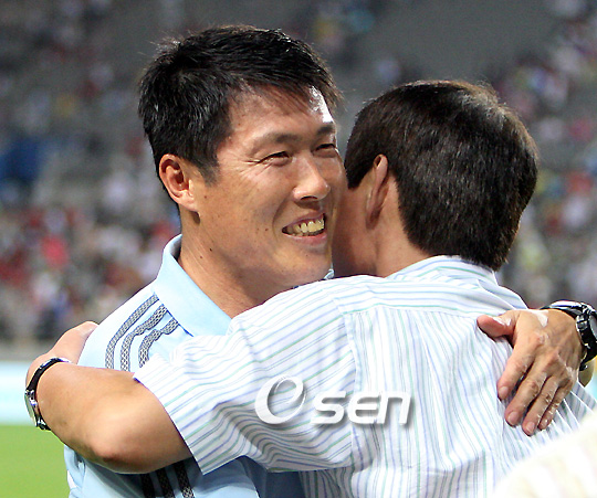 "한편의 드라마였습니다". 라이벌 FC 서울에 극적인 승부차기 승리를 챙긴 차범근 감독은 '축구 드라마'를 본 것 같다고 했다. 차 감독이 이끄는 수원은 12일 서울월드컵경기장에서 열린 서울과의 FA컵 8강전에서 역전을 허용했다가 경기 종료 직전인 후반 43분 천금같은 동점골로 균형을 이뤘고 결국 승부차기에서 6-5로 이겨 짜릿한 승리의 쾌감을 만끽했다. 경기 장면을 돌아보면 차 감독의 말에 쉽게 동의할 수 있다. 수원은 후반 9분 실바의 선제골로 1-0으로 앞서가다 후반 22분과 32분 내리 두 골을 얻어맞아 1-2로 뒤졌다. 하지만 패색이 짙던 후반 43분 수비수 마토가 프리킥을 서울 골망에 꽂아 천신만고 끝에 동점을 만들었다. 하지만 수원은 승부차기 들어 두 번째 키커 실바가 실축해 낙담했다. 여기서 골키퍼 박호진이 두 차례 선방행진을 벌여 말 그대로 극적인 승리를 거뒀다. 차 감독은 경기 결과는 물론 내용면에서도 훌륭한 경기라고 했다. "너무 좋은 경기였다"는 말을 되풀이했다. 프로축구 최고의 라이벌전이었던 만큼 경기장 분위기도 최고였다. 차 감독은 대회 16강 대전 시티즌전에 이어 2경기 연속 승부차기 승리를 이끌어낸 골키퍼 박호진에 대해선 "서울의 대표급 선수들의 킥을 훌륭하게 막아냈다"며 칭찬을 아끼지 않았다. 또한 차 감독은 "새로운 선수들이 많이 영입됐는데 조직력을 끌어올려 FA컵은 물론 후기리그에서도 좋은 성적을 낼 수 있도록 하겠다"고 말했다. 최근 영입된 백지훈에 대해서는 대표팀을 오가며 활동해야 하는 점을 감안, 시간을 두고 컨디션을 끌어올릴 수 있도록 배려하겠다는 뜻도 밝혔다. iam905@osen.co.kr > 차범근 감독이 경기 후 관계자의 축하를 받고 있다./상암=손용호 기자spjj@osen.co.kr