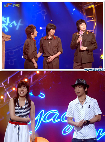 대한민국 개그계의 양대산맥인 KBS '개그콘서트(이하 개콘)'와 SBS '웃음을 찾는 사람들(이하 웃찾사)' 중 네티즌이 뽑은 '진짜 웃긴 개그프로그램'은 어느 것일까? 음악포털사이트 벅스에서 8월 3일부터 10일까지 '개콘'과 '웃찾사'를 놓고 '핫이슈-진짜 웃긴 개그프로 누구야~'라는 주제의 설문조사를 실시한 결과 네티즌 1241명 중 60%인 746명이 SBS '웃찾사'의 손을 들어 주었다. '웃찾사'는 '나몰라 패밀리', '육아일기', '이건 아니잖아', '형님뉴스' 등 굵직한 코너들이 높은 인기를 얻고 있으며 ‘뉴스가 뉴스다워야 뉴스지’, ‘이건 아니잖아', ‘따라와’, ‘코봉아 코봉아 죽어라’와 같은 다양한 유행어를 만들어 내기도 했다. '개콘'은 40%인 495명의 지지율을 받았는데 이는 최근 ‘고음불가’ 등의 인기코너가 막을 내리고 새로운 코너들이 대거 만들어지면서 아직은 시청자들에게 생소하게 받아들여지고 있는 것이 원인으로 분석된다. 그러나 ‘고교천왕’, ‘오빠’, ‘깐깐한 권의원’ 등의 신설 코너가 좋은 반응을 얻고 있으며 ‘집으로’, ‘사랑의 카운슬러’, ‘봉숭아 학당’ 등이 꾸준한 인기를 얻고 있어 '웃찾사'와 비교할 수 없는 또 다른 재미를 선사하고 있다. 일단 결과는 '웃찾사'의 승으로 나왔지만 워낙 막상막하한 프로그램이다보니 네티즌들 사이에서는 여전히 논쟁 중이다. 아이디 trator라는 네티즌은 “'개콘'은 일상생활을 코믹하게 그려내 공감 가는 부분도 많고 사회풍자 등 진정한 개그를 선보여 좋다”고 말했으며 아이디 15151843은 “'웃찾사'는 보고 있으면 웃음이 날 정도로 새로운 유행어를 계속 만들어내 재밌다”는 의견을 보였다. hellow0827@osen.co.kr 웃찾사의 '저요저요'(위)와 개콘의 '사랑의 카운슬러'. / SBS KBS 제공.