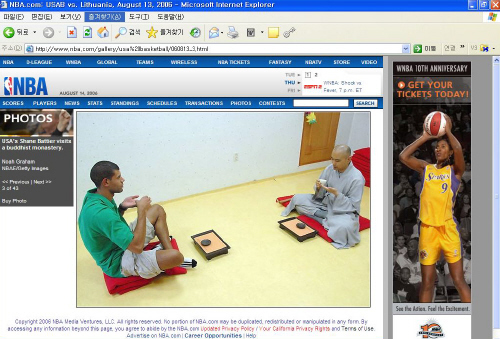 비타 500 월드바스켓볼챌린지(WBC) 2006 대회에 참가 중인 미국대표팀의 셰인 배티어(28, 휴스턴)의 남다른 '불교 사랑'이 화제다. 현재 미국 대표팀 감독인 마이크 지제프스키를 스승으로 모시며 듀크대에서 뛰었던 배티어는 지난 1999년과 2001년 팀을 NCAA(미국대학체육회) '파이널 포'로 이끌었다. 1999년에는 코네티컷대에 74-77로 져 우승이 좌절됐지만 2001년에는 애리조나대를 82-72로 완파하고 우승컵까지 들어올렸다. 1999년 전체 1순위로 시카고 불스에 입단한 '선배' 엘튼 브랜드(LA 클리퍼스)와 함께 듀크대의 전성기를 이끌었던 배티어는 지난 2001년 드래프트 전체 6순위로 멤피스 그리즐리스에 입단한 뒤 지난 6월 휴스턴 로키츠의 유니폼으로 바꿔 입었다. 이런 그가 불교에 관심있어하는 것은 그리 많이 알려지지 않은 사실. 배티어는 지난 2000년 팬들과의 인터뷰에서 "기독교를 믿고 있긴 하지만 불교에 상당한 관심이 있고 '선(禪) 사상'은 농구를 하는 데 큰 영향을 준다"며 "농구와 학업 모두 강한 의지와 평정심을 갖고 해야 한다는 공통점이 있다"고 밝혔다. 이어 배티어는 "농구나 학업 모두 너무 과해도 안되고 너무 모자라서도 안되는 중도(中道)의 길을 걸어야 하는데 이것이 바로 불교의 사상"이라고 말했다. 이랬던 그가 한국을 방문해 불교 사찰을 찾은 것은 어쩌면 당연한 일. 배티어는 지난 13일 리투아니아와의 경기가 열리기 직전 아침에 숙소인 서울 삼성동 코엑스 인터컨티넨탈 호텔 바로 앞에 있는 봉은사를 찾아 스님과 녹차를 마시면서 많은 얘기를 나눴고 이 장면이 바로 미국 프로농구 NBA 공식 홈페이지(www.nba.com)에 그대로 실렸다. 이날 배티어와 만남을 가지며 녹차를 마신 선업 스님은 "평소에 배티어가 불교에 관심이 많았다는 얘기를 들었다"며 "마침 참선을 갖는 시간이어서 함께 참석했는데 끝나고 나서 머리가 맑아져 기분이 좋고 미국에서도 참선을 해야겠다는 얘기를 했다"고 밝혔다. 농구를 하면서 너무 과해서도 안되고 너무 모자라서도 안되는 '중도'를 몸소 실천하려는 배티어의 행동은 한국 선수들에게 시사하는 바가 크다. 이탈리아를 꺾겠다는 욕심이 너무 과한 나머지 오히려 경기를 스스로 망치며 35점차 대패를 했기 때문이다. tankpark@osen.co.kr 셰인 배티어가 봉은사를 찾아 스님과 녹차를 마시고 있는 사진이 공개된 NBA 공식 홈페이지.