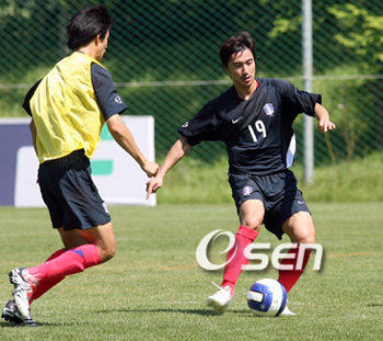 세대교체에 나선 '베어벡호'에 즐거운 비명이 울려퍼졌다. 비록 상대가 국제축구연맹(FIFA) 랭킹 144위의 약체 대만이었지만 미래에 대한 가능성을 봤다. '고참' 안정환(30)이 포문을 열자 한참 어린 '킬러' 정조국(22.서울)은 신난 듯 득점포를 쏘아올렸다. 안정환과 정조국은 16일 대만 타이베이 충산 스타디움에서 열린 대만과의 2007 아시안컵 B조 예선 2차전 원정 경기에 선발 출전해 전반 31분과 후반 9분 각각 팀의 첫 번째, 두 번째 골을 뽑아내며 핌 베어벡 감독에 데뷔전 승리를 안겼다. 당초 이 둘 중 한 명만 나설 것이라는 예상과 달리 함께 출격한 이들은 베어벡 감독의 신뢰에 골로서 보답했다. 태극호 신구 킬러들의 의미있는 골퍼레이드였다. "이번이 마지막 아시안컵"이라고 공언한 안정환은 독일 월드컵 조별리그 1차전 토고전 역전골에 이어 위기에서 다시 한번 골을 터뜨리며 '역시! 해결사'란 감탄사를 자아내게 했다. 0의 행진이 이어지던 전반 31분 안정환은 '주장' 김남일의 침투 패스를 받아 상대 골키퍼가 나온 틈을 놓치지 않고 볼이 땅에 떨어지기 전 논스톱으로 툭 차넣었다. 남다른 발 재간을 자랑하는 안정환의 감각적인 골이었다. 선배가 물꼬를 트자 후배도 뒤질 수 없었다. 비행기에 오르기 앞서 베어벡 감독의 극찬을 받은 정조국은 후반 9분 이을용이 페널티지역 왼쪽에서 볼을 띄워주자 골지역으로 달려들면서 오른발로 침착하게 골문 안으로 때려넣었다. 골맛은 다른 어떤 골보다 달콤했다. 정조국은 A매치 데뷔골을 경험했다. 이어 정조국은 풀타임을 뛰며 베어벡 감독의 강한 눈도장을 받았다. 지난 2002년 한일 월드컵부터 대표팀 부동의 스트라이커로 군림해왔던 안정환과 '베어벡호'가 출범하면서 다시 떠오르고 있는 정조국이 나란히 이날 골을 터뜨림에 따라 공격수 주전 경쟁은 한층 치열하게 전개될 전망이다. 다음 달 2일 열릴 이란과의 대회 3차전에서는 독일 월드컵에서 원톱으로 선발에 나섰던 조재진이 부상을 털고 복귀할 것으로 보여 주전 경쟁은 가열될 것으로 보인다. 이날 벤치에 앉아있던 신영록도 발 끝을 매섭게 돌리고 있다. 내년 아시안컵 본선 우승과 2010년 남아공 월드컵 최소 16강을 목표로 내건 베어벡 감독은 '킬러'들의 활약에 행복한 미소를 짓고 있다. iam905@osen.co.kr 파주 훈련서 가진 미니게임서 볼을 다투는 정조국(왼쪽)과 안정환.