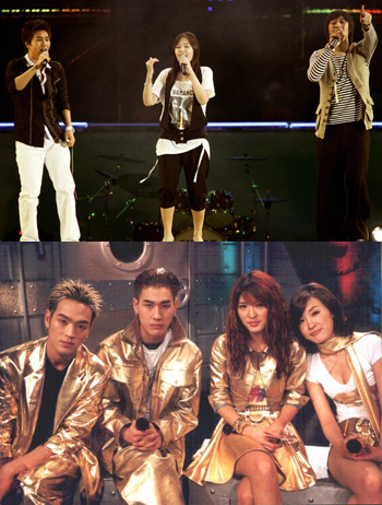 뜨거운 여름을 맞아 그 어느 때보다도 많은 혼성그룹들이 등장하고 있다. 이들은 너도나도 ‘제 2의 쿨’을 자청하며 쿨의 빈자리를 메우기 위한 쟁탈전이 한창이다. 그런데 그동안 인기를 얻었던 혼성 그룹들을 자세히 살펴보면 대부분 여성 멤버의 활약에 따라 성공 여부가 달라지고 있음을 알 수 있다. 10 여 년 전으로 시간을 거슬러 올라가 1994년 데뷔한 라이벌 혼성그룹 룰라와 투투를 예로 들어보자. ‘100일째 만남’으로 데뷔한 룰라는 메인보컬을 맡은 김지현이 시원시원한 가창력과 섹시한 몸매로 단연 두각을 나타냈으며 후에 채리나가 새롭게 영입된 후 더 큰 인기를 얻었다. 같은 해 ‘일과 이분의 일’이라는 독특한 곡으로 가요계에 첫발을 디딘 투투는 여성 멤버 황혜영의 인형 같은 얼굴과 특유의 무표정이 팬들의 많은 사랑을 받았던 인기요인이었다. 비단 이들 뿐만이 아니다. 스페이스 A는 여성보컬 루루의 활약으로 이름을 알렸으며 95년 데뷔한 4인조 혼성그룹 UP는 발랄한 이미지의 메인보컬 이해정과 보이시한 매력의 이정희로 인해 시선을 끌었다. 또한 ‘정’의 영턱스클럽도 임성은과 한현남, 송진아 덕에 더 큰 유명세를 치렀다. 1998년에 데뷔해 2002년 해체한 후 현재 멤버들 각자 활발한 활동을 벌이고 있는 샵의 경우도 마찬가지다. 샵은 비교적 4명의 멤버들이 골고루 얼굴을 알린 케이스이지만 여성 보컬 이지혜와 서지영의 인기가 단연 높았다. 같은 해 데뷔한 코요태 역시 신지의 귀여운 외모와 가창력 그리고 솔직한 성격이 많은 사랑을 받을 수 있었던 주된 요인이었으며 기존 남자 멤버들이 빠지고 김종민과 빽가가 새롭게 합류한 후 현재는 3명의 멤버가 각자의 위치에서 모두 사랑 받고 있다. ‘제 2의 코요태’라는 닉네임을 얻고 있는 신인 타이푼도 보컬 솔비의 인지도가 상승하고 있는 중이며 자우림, 럼블피쉬, 체리필터, 러브홀릭 등도 비슷한 케이스다. 대표적인 혼성그룹인 쿨의 경우에도 94년 데뷔 당시에는 이재훈과 김성수 등 남성 멤버들의 활약과 함께 삭발한 여성 멤버 유채영이 눈길을 끌었으며 2집 앨범부터 참여한 여성 보컬 유리의 영입 이후 대중적으로 더 많은 사랑을 받았다. 혼성그룹에서 여성 멤버가 성공의 열쇠를 쥐고 있을 수밖에 없는 이유는 대부분 이들이 메인보컬의 역할을 맡고 있기 때문이다. 그룹에서 메인보컬의 이미지는 팀의 색깔을 결정짓는 중요한 역할을 하기 때문에 그 만큼 이들의 활약 여부가 팀의 성공을 좌우할 수 있는 요소로 작용하게 되는 것이다. 물론 여성 멤버만 인기가 있다고 해서 팀이 유지될 수 있는 것은 절대로 아니다. 대표적인 여름 그룹 쿨이나 거북이처럼 모든 멤버들이 함께 조화를 이룰 때 장수할 수 있는 법이다. 그룹에서 특정 멤버의 활약이 팀의 인지도를 끌어올리는 데는 기여할 수 있지만 이를 오랫동안 유지하고 더 크게 키워나가는 데는 모든 멤버들의 노력이 수반돼야 한다. 최근 타이푼, 바나나보트, 아일랜드시티, 무가당, 에이브릿지 등 많은 혼성그룹들이 잇따라 데뷔해 활동을 벌이고 있는 가운데 앞으로 이들의 활약 역시 관심을 갖고 지켜볼 일이다. hellow0827@osen.co.kr 코요태(위)와 샵/ 샵 사진 Mnet 제공.