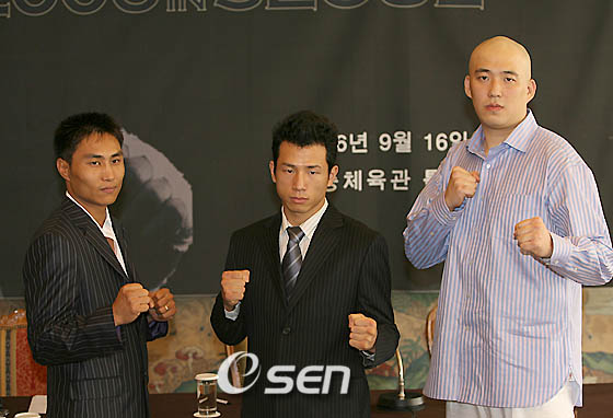 17일 오후 신라호텔에서 오는 9월 16일 장충체육관에서 벌어질 K-1 파이팅 네트워크 KHAN 2006 서울 대회 홍보 기자회견이 열렸다. 이번 대회서 데뷔할 전 프로복싱 세계챔피언 최용수와 초대 KHAN 챔피언 임치빈, 태권도 선수 출신으로 스페셜 매치를 가질 박용수(왼쪽부터)가 나란히 포즈를 취하고 있다./김영민 기자ajyoung@osen.co.kr