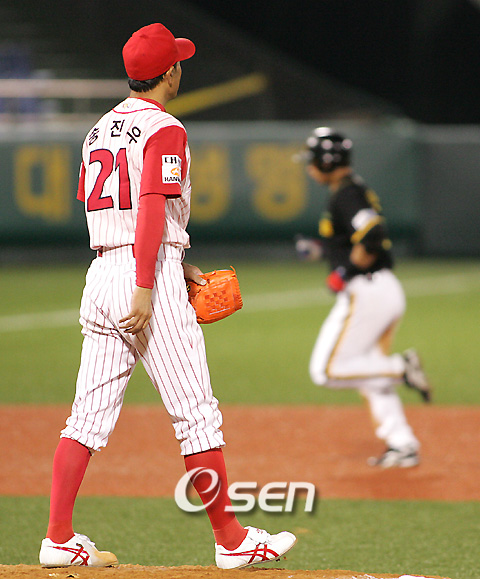 프로야구 첫 개인 통산 200승에 단 1승을 남겨두고 3차례의 쓴 맛을 본 뒤 22일 대전 구장서 현대를 상대로 4수에 나섰던 송진우가 또다시 대기록 달성에 실패했다. 2-2 동점이던 7회초 2사 2,3루서 송지만에게 좌월 역전 3점 홈런을 허용한 송진우가 허탈한 모습으로 베이스를 도는 송지만을 바라보고 있다./대전=손용호 기자spjj@osen.co.kr