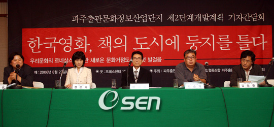 파주 출판문화 정보산업단지 제2단계 개발계획 '한국 영화 책의 도시에 둥지를 틀다' 기자간담회가 23일 서울 프레스센타 19층에서 열렸다. (왼쪽부터 '도서출판 생각의 나무' 박광성 대표, '마음산책' 정은숙 대표,출판도시 문화재단 이기웅 이사장, 싸이더스FNH 차승재 공동대표, '김영준도시건축' 김영준 소장.) /박영태 기자 ds3gfan@osen.co.kr
