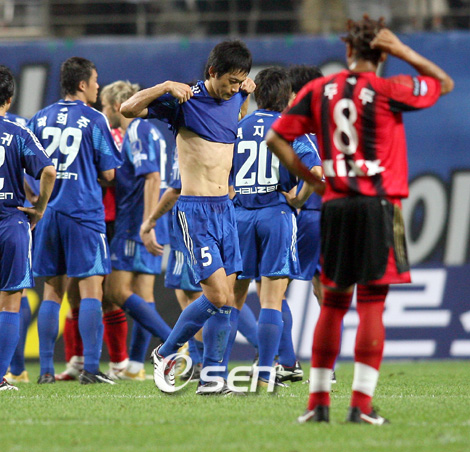 23일 서울 상암 월드컵 경기장에서 벌어진 삼성 하우젠 2006 후기리그 FC 서울과 수원 삼성의 경기 후반 서울 안태은이 수원 이관우를 반칙으로 넘어뜨리자 수원의 김남일이 안태은을 밀치며 말다툼을 벌이고 난 뒤 고금복 주심으로부터 경고 2회에 따른 퇴장 명령을 받은 김남일이 유니폼을 들어 올리며 나가고 있다./상암=박영태 기자 ds3fan@osen.co.kr