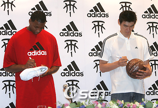 NBA 스타 트레이시 맥그레이디가 25일 서울 삼성동 코엑스 컨티넨탈 호텔에서 방한 기자회견을 가졌다. 마이클 조던에 가장 가까운 선수로 평가된 맥그레이디는 35초 동안 13득점이란 신기에 가까운 플레이로 '티맥'이란 애칭으로 불리운다. 김주성과 맥그레이디가 '티맥 1 리미티드 에디션' 농구화와 농구공을 서로 교환하기에 앞서 사인하고 있다./손용호 기자spjj@osen.co.kr