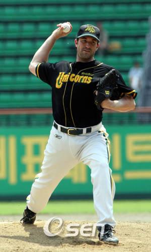 역시 KIA 킬러였다. 현대가 KIA를 상대로 올해 11승째(3패)를 거두었다. 현대 선발투수 캘러웨이는 2년 연속 10승 고지를 밟았다. 김재박 현대감독은 프로 통산 5번째로 1400경기에 출전했다. 현대는 26일 KIA와의 광주경기에서 KIA 마운드의 자멸과 홈런 2개 등 집중타를 터트려 8-2로 손쉬운 승리를 거두었다. 올 시즌 KIA전 11승 3패의 압도적인 우위. 현대는 54승44패1무를 기록, 2위를 지켰다. 현대보다 2개 많은 15안타를 치고도 2득점에 그친 KIA는 46승46패3무로 5할 승률이 위협받게 됐다. 차임벨이 울리자마자 승부가 결정났다. 현대는 1회초 공격에서 모두 13명의 타자들이 등장했다. 1회초 공격시간 34분. KIA는 1회 현대 타자들을 막느라 이동현 박정태 조태수 등 3명의 투수들이 나왔다. 현대 타자들이 잘했기 보다는 KIA 투수들이 사사구를 남발하며 자멸했다. 1회초 선두타자 송지만이 좌월 솔로홈런으로 포문을 열었다. 전준호가 볼넷을 골랐고 1사후 서튼이 우월 투런아치를 그려 3-0. 이후 KIA 선발투수 이동현은 정성훈을 볼넷으로 출루시키고 강판. 바뀐 투수 박정태가 이숭용을 좌익수플라이로 잡고 1회를 마치는가 싶더니 김동수에게 좌전안타, 채종국에게 좌익수 왼쪽으로 빠지는 2루타를 맞고 한 점을 보태주었다. 현대는 계속된 2사2,3루에서 서한규가 사구로 만루를 만들었고 3연속 밀어내기 볼넷을 얻어 3점을 거져 주었다. 7-0. 관중석에서는 야유가 터져나왔다. 현대는 1회에만 홈런 2개 포함 4안타 6사사구로 승부를 결정냈다. 이후 KIA는 부지런히 안타를 터트리며 문을 두드렸으나 캘러웨이의 노련한 피칭에 말려 추격에 실패했다. 2회말 3연속안타로 한 점 뽑았고 7회 한 점을 보탠게 전부였다. 15안타를 치고 잔루 14개를 기록하는 졸공이었다. 캘러웨이는 6이닝동안 8안타를 맞았으나 1실점으로 막고 시즌 10승째(7패)를 챙겼다. 지난해에 이어 2년연속 두 자릿수 승리. 김재박 감독은 이날 통산 1400경기에 출전, 762승 602패36무를 기록했다. KIA 선발 이동현은 ⅓이닝 2안타2볼넷 4실점, 패전투수가 됐다. 한편 사직경기에서는 SK가 12안타를 치고 신승현의 호투에 힘입어 롯데를 4-0으로 누르고 시즌 50승째를 거두었다. 이날 경기가 없었던 두산을 승률에서 제치고 5위에 올라섰다. 신승현은 7승째를 수확했다. 롯데 선발 염종석이 패전투수. sunny@osen.co.kr 캘러웨이.